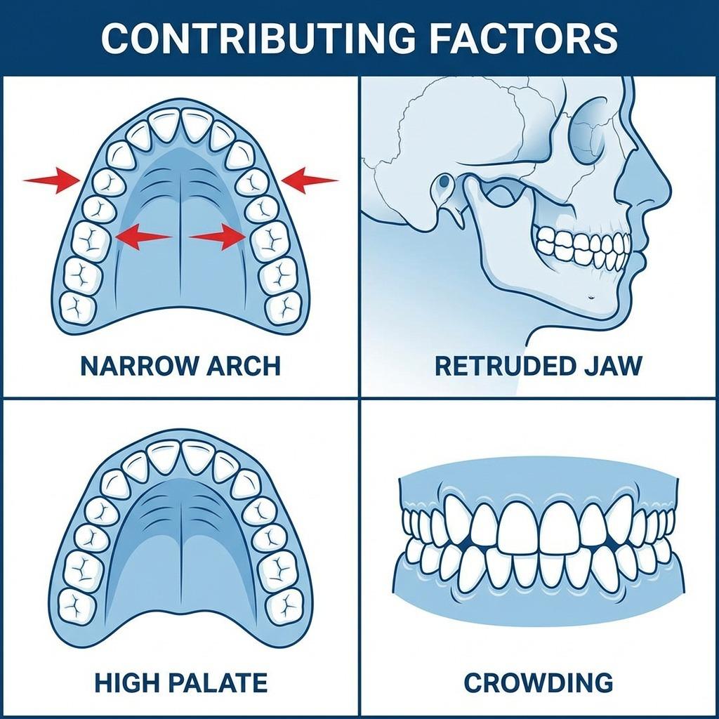 Crowding, deep bites, and retrognathic profiles may worsen breathing patterns.